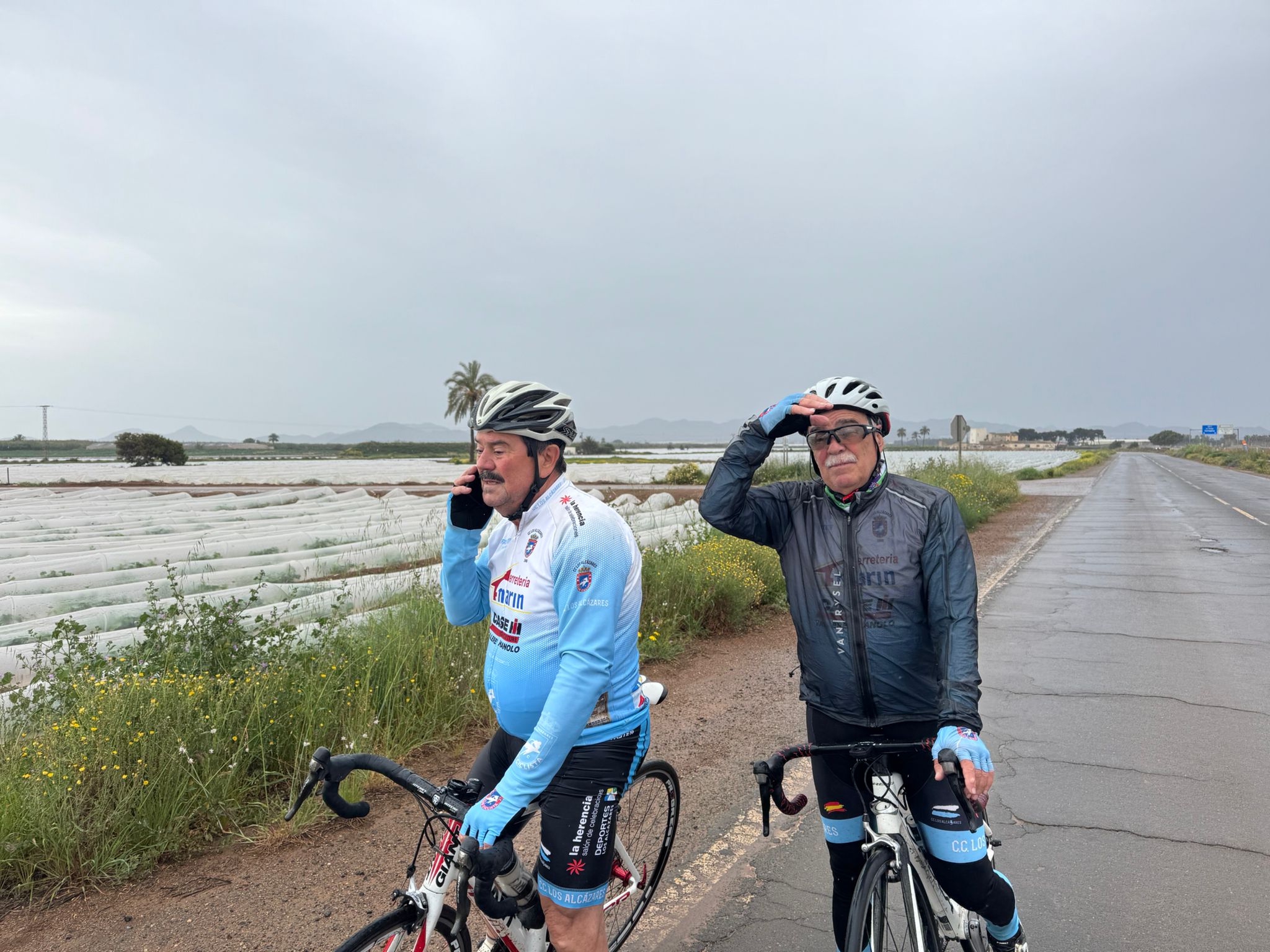 Preparados para la salida. Unos 16 ciclistas. Malas previsiones ambientales.