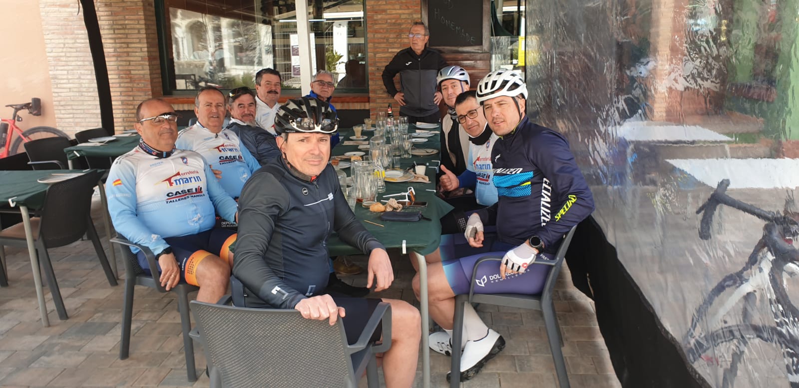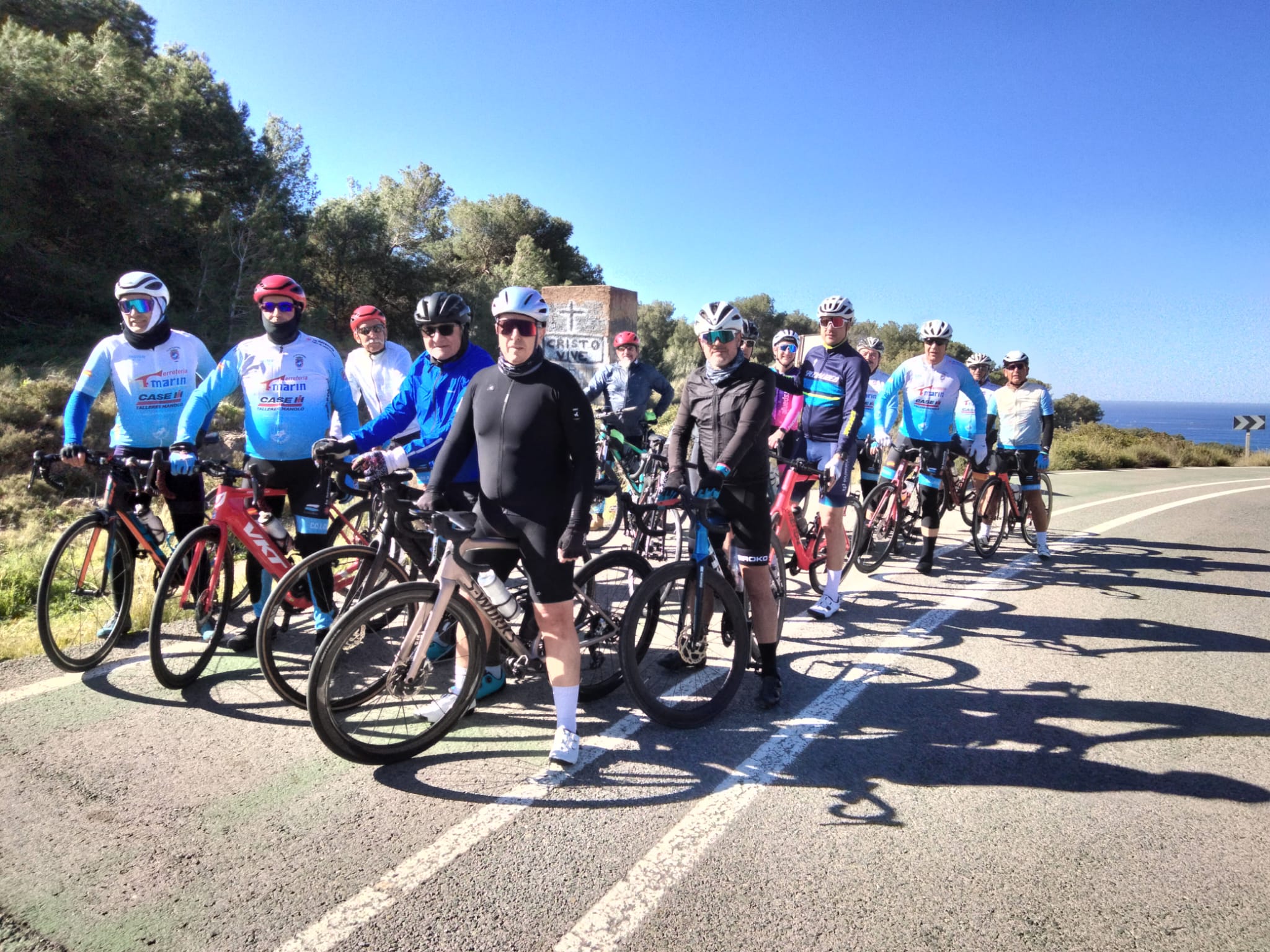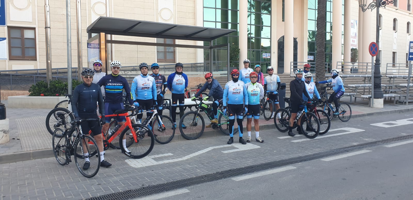 Preparados para la salida. Unos 18 ciclistas.